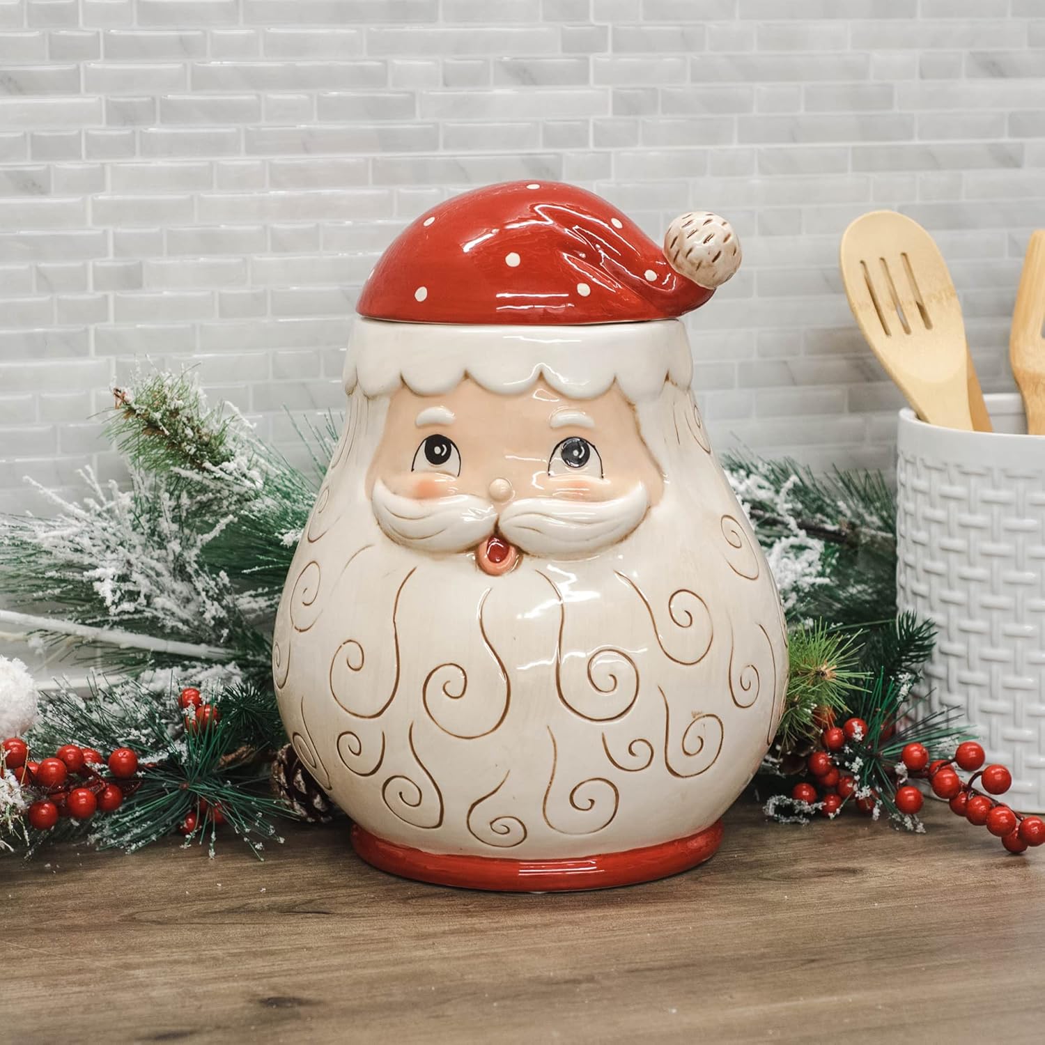 Designed by Johanna Parker for Transpac, this Jolly Santa Cookie Jar is made to make your Christmas sweeter! Santa's beard is decorated with swirls for added detail and Santa's hat as a lid. Brand New mint condition. Perfect for the JP or santa collector!